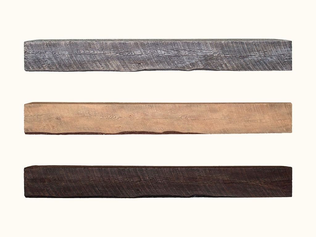 Ambiance® Rough Sawn Beam Non-combustible Mantel show an extraordinary realistic wood look while being resistant to heat. Available in 5′ or 6′ size and in three colors to fit your fireplace and decor. They are suitable for outdoor applications. Ideally, protected from the elements as part of an integrated fireplace/pergola combination. Unprotected, the surface will accumulate white salt leaching that needs to be removed with a 50/50 solution of water and vinegar. The surface would also need to have a protective sealer applied at least twice per year to protect against the freeze-thaw cycles in colder climates. They are molded directly from antique timbers salvaged from historic barns, farms, homes, and cabins across the Kentucky Bluegrass region. Crafted with a patented non-combustible Burncrete casting to authentically replicate the rich wood grain and character details of antique wood. The result is a unique non-combustible peace of art! Available to order in 6ft, stocked in 5ft.